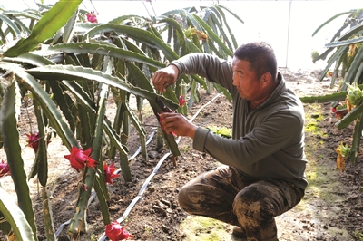 2017年,白城市民张玉泉从海南引进2000棵火龙果苗木,在洮北区到保镇复兴村租大棚试种成功。去年收入8万元,今年收入达10万元以上。据悉,明年春节期间还会有大量火龙果可供采摘。 本报记者王野村摄