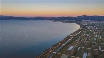 初冬时节,云南省玉溪市通海县风景秀丽,山峦、湖水与农田组成了一幅美丽的田园诗画卷。 新华社记者胡超摄