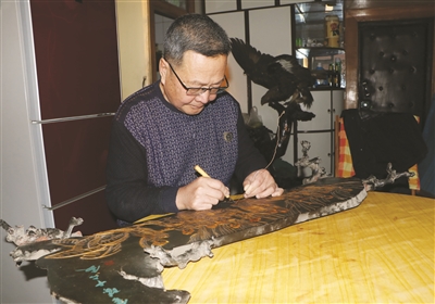 高乃峰告诉记者,作画先构思于脑,图纸上笔画越多效果越好,同时还要处理好根须的疏密度,粘贴前还要根据根须半径刻取出同等半径的凹槽,凹槽完成后将根须逐一粘贴到画板上,粘贴过程细致入微,每个细节的处理都要反复锤炼才能达到完美效果。粘贴完成后的作品需每天喷一次漆,隔天晾干后再喷漆,经过反复12次喷漆才能达到立体效果。