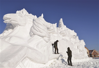 12月3日,呼伦贝尔(牙克石)第三届国际雪雕邀请赛在内蒙古牙克石市凤凰山雪谷广场开赛。来自国内外的20支队伍参加为期四天的角逐。 新华社记者徐钦摄