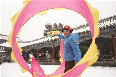 12月16日,在北京天坛公园,一名市民雪中健身。当日,北京迎来降雪天气。