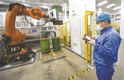12月16日,廊坊百花蜂产品有限公司投料车间工人在操作机器人抓起蜂蜜原料桶进行投料。