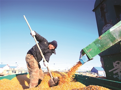 近年来,镇赉县严格落实耕地保护政策,贯彻实施精准扶贫方略,不断加大对土地的综合整治力度,激励农民实现脱贫致富,使粮食产量逐年增收。图为近日镇赉县建平乡农民在进行玉米脱粒,准备出售。