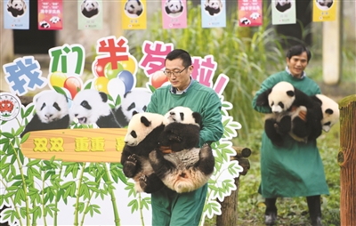 当日,重庆动物园为4只大熊猫宝宝“双双”“重重”“喜喜”“庆庆”举行半岁生日庆祝活动。4只半岁大熊猫在饲养员的照料下,在熊猫馆运动场内玩耍、嬉戏,与市民游客一同过冬至。 新华社记者唐奕摄