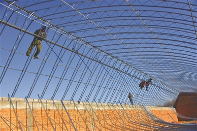 今年10月份开工建设、总投资350万元的白城市大陶河苏蔬菜种植专业合作社温控大棚建设项目,位于洮北区德顺蒙古族乡洮河村,项目占地2.6万平方米,建有8个温控式大棚,建筑面积5760平方米,项目建成后可带动洮河村贫困户80户163人,每人每年预计分红300元。图为项目施工现场。 王维俊 本报记者张殿文摄