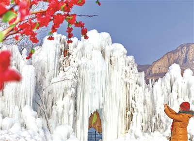 12月25日,游客在平山县沕沕水景区拍摄冰瀑美景。