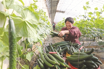 12月28日,河北省唐山市丰润区忠宏农作物种植农民专业合作社社员在大棚内收获黄瓜。