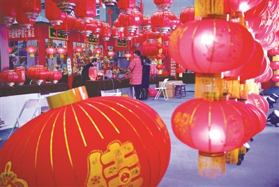 1月9日,市民在西安年货节上选购灯笼。