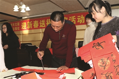 无联不成春,有联春更浓。日前,由白城市文联和白城日报社共同举办的“迎新春送福联谊活动”在白城日报社拉开帷幕。活动现场气氛热烈,墨香年味儿弥漫,来自白城市文联的10余名书画家纷纷挥毫泼墨。笔走龙蛇间,一张张遒劲有力的福字;笔酣墨饱间,一幅幅吉祥如意的国画及春联,呈现在大家面前,浓浓的情意,美好的祝福,让传统节日在新时代展现出新的光彩。