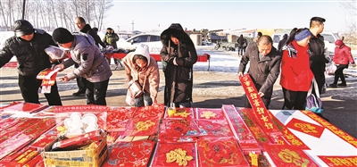1月21日、22日,记者分别来到洮北区林海镇、洮河镇年货大集。走进大集,摊位上的货物可谓琳琅满目,火红的春联、闪金的福贴、大红的灯笼、鲜艳的盆花……烘托出浓浓的节日气氛。在大集上,平时少见的民俗年货也热闹上市,蔬菜、肉品、衣服、地道的农家土特产,各式各样的干果、糕点等等分区摆放,赶集的人们来来回回穿梭在市场里,川流不息的人群、欢快的叫卖声,到处洋溢着春节的味道。如今生活好了,虽然商场超市里东西也很齐全,但是逛年货大集仍然是农民欢庆春节的一种不可或缺的方式。