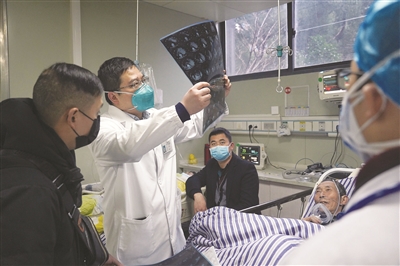 1月25日,南昌大学第一附属医院急诊科医生(左二)在急诊抢救室里查看患者的病情。