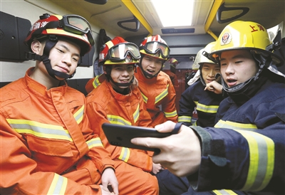 1月24日,上海长宁区消防救援支队消防员在消防救援车内用手机观看春节联欢晚会。 除夕夜,在这万家团圆的日子里,消防救援人员依旧在岗位上执勤,守护平安。 新华社记者陈飞摄