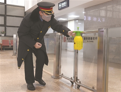春节期间,北京西站提升对新型冠状病毒感染的肺炎疫情防控,现已设置多部体温检测设备,并加强对工作人员的防护和对旅客的检测,及时对站内进行消毒,保障旅客生命安全。新华社发(任超摄)