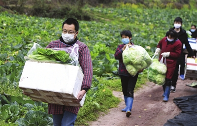2月5日,重庆市云阳县青龙街道马沱村蔬菜基地工作人员在搬运刚从地里收获的蔬菜。