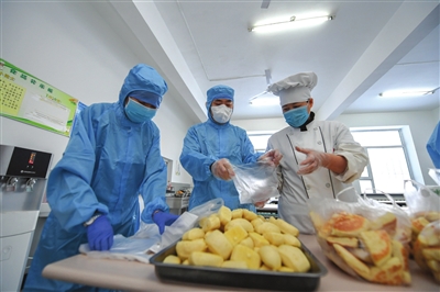 2月7日,在吉林省长春市朝阳区重庆街道办事处“爱心食堂”,工作人员在配餐。