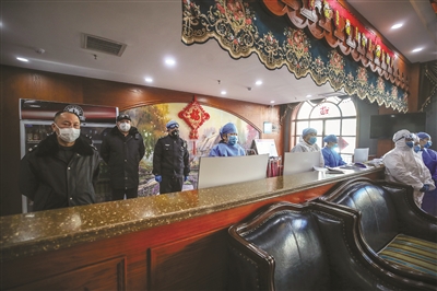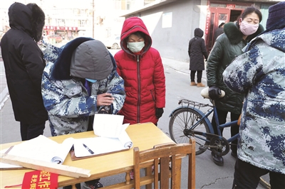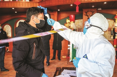 (图八)在疫情防控卡点,共产党员在为群众测量体温。 本报记者李晓明摄
