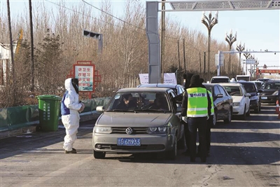 (图三)大安市广大医疗工作者、交通干警放弃春节假日休息,上路对来往车辆和人员进行身份登记和测量体温防疫检查。 谷春雷摄