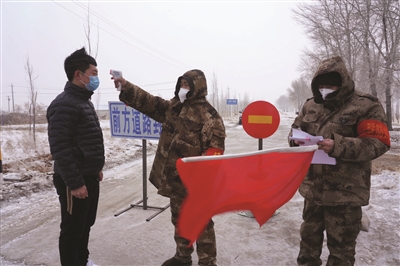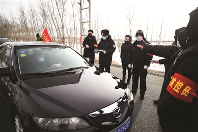 (图十三)镇赉县哈吐气蒙古族乡呼兰村年轻党员康维亮(中)请缨到一线防控执勤。他每天除了在村口卡点做检测体温、检查登记的工作,他还积极参与村里的“大喇叭”广播和发放宣传单。大家说“康维亮不仅是咱村的‘守门员’,还是合格的宣传员。” 潘晟昱摄