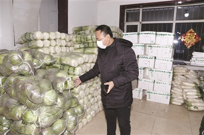 (图六)共产党员、白城市商务局市场运行和消费促进科科长陈兆权,为了全市百姓在抗击疫情的关键时刻能吃上新鲜蔬菜,从1月27日开始他每天5时左右就来到白城市保胜农产品批发市场,督查农产品市场进出车辆的消毒、司机的体温检测,蔬菜储运等工作,从一家蔬菜批发摊点出来进另一家蔬菜批发摊点……20多家批发蔬菜大户走一圈得3个多小时。他用行动践行着共产党员的先锋模范作用。图为他在梅峰蔬菜批发点了解大白菜市场供需情况。 本报记者王野村摄