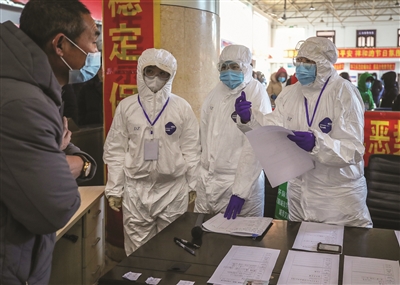 (图七)坚守在来白和返白人员分流点的一线工作人员耐心为咨询人员解答疑问。 本报记者李晓明摄