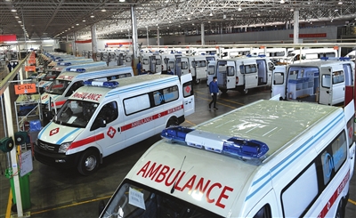 2月16日,上汽大通汽车有限公司无锡分公司改装车间内摆满了正在改装的负压救护车。
