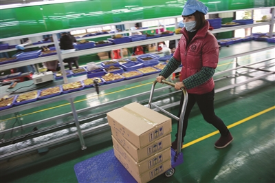 2月20日,在湖南桃源县幸福苑扶贫车间,工作人员将打包好的电感器拖运至仓库。