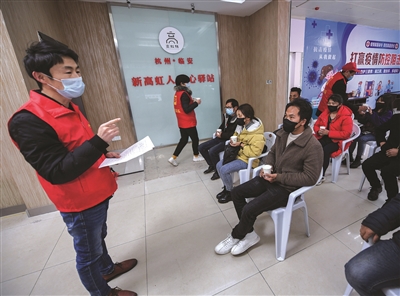 3月1日,高虹镇的党员志愿者在暖心驿站内给刚刚抵达的外来务工人员介绍最新的防疫知识及相关政策。