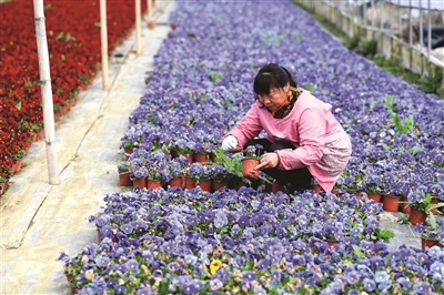近日,安徽省肥西县花岗镇现代农业示范区花卉种植基地的各类花卉长势喜人,花农在做好疫情防控的同时,有序开展春季管护工作,花棚内外一片忙碌景象。