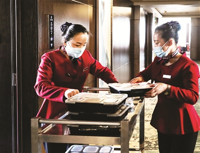 目前,我市疫情防控工作取得了阶段成果和良好成效。为加快恢复正常生产生活秩序,我市坚持“应开尽开、精准管控、激活市场、保障民生”原则,全面恢复各类场所正常营业。各地营业场所在经营的同时继续抓好防控工作。图为大安宾馆餐饮部为避免顾客在餐厅密切接触,将密封好的早餐分发到各个房间。 本报记者李晓明摄