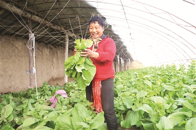通榆县开通镇东郊村七社农民王明侠今年种植了两个大棚的应季蔬菜,预计收入近5万元。看,正在摘蔬菜的王大娘笑得多开心。 本报记者张殿文摄