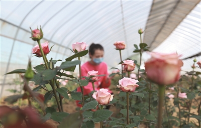 4月16日,在河北省南和县郝桥镇南郝村一家庭农场,村民在温室大棚内采摘玫瑰。