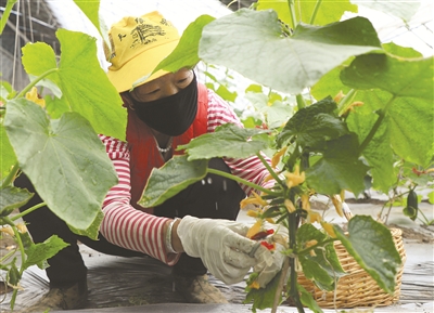 4月22日,一位村民在清除黄瓜残叶。