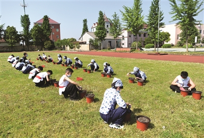 “五一”国际劳动节来临之际,浙江省诸暨市姚江镇上联小学在严格防疫的同时,分班错时开展农耕劳作专题实践活动。