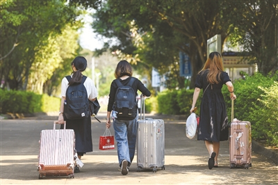 5月9日,在位于海口的琼台师范学院桂林洋校区,返校大学生带着行李前往各自宿舍。