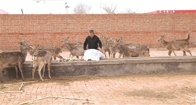 通榆县双岗镇双岗鹿场社区居民王猛有3年多的养鹿经验,由开始的30余头发展到现在的100余头,每头鹿价值在一万元以上。依靠鹿的附加产品,如鹿茸、鹿心粉等,每年还能收入近40万元。此外,他还安置了3名贫困农民在此就业,受到附近群众好评。本报记者 张殿文摄