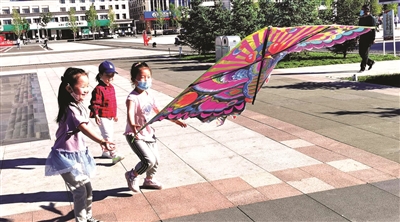 6月1日,小朋友在市区市民广场做游戏、放风筝。
