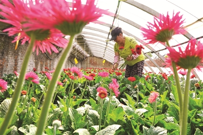 6月8日,唐山市古冶区西李家套村的农民在大棚内采摘非洲菊。