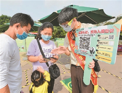 广州长隆野生动物世界恢复开放,实施线上预约、健康登记、体温监测等多项管理措施。图为工作人员在门口指引游客出示健康码。 新华社记者刘大伟摄