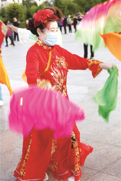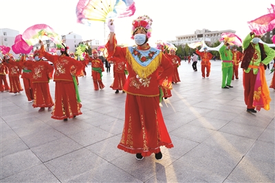 入夏后,白城市鹤乡夕阳美秧歌队的老年人自发组织起来,在领头人王大姐的带领下,少则10多人,多则30多人,每天傍晚6时20分准时到市区阳光广场扭秧歌。大家都佩戴口罩,并保持着一定距离。这支队伍中,年龄最大的80岁,最小的40岁。平时活动时,大家拿着扭秧歌的手绢和扇子就可加入到队伍中,遇到节日或演出排练,队员们主动装扮上,无论是统一的服装,还是佩戴的头饰都精心打理,到广场一亮相,非常吸引人。日常活动时,王大姐和队里的技术指导会逐一纠正队员们的动作,保证动作标准和协调。作为我市非常有名气的一支秧歌队,他们曾荣获全市秧歌大赛二等奖。