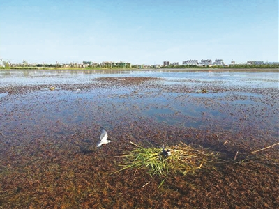 凤头䴙䴘妈妈把雏鸟驮在背上游弋,鸟爸爸则不断潜入水里抓小鱼喂给雏鸟;白骨顶鸡、红骨顶鸡幼鸟跟随父母在芦苇荡觅食,它们天生就是游泳健将;喜欢群居的须浮鸥把巢筑在沉水植物的上面,形成了一处处水上“小区”,同一“小区”的雏鸟出生时间差异很大,有的须浮鸥已在抚育出壳的雏鸟,有的却还在筑巢孵卵……