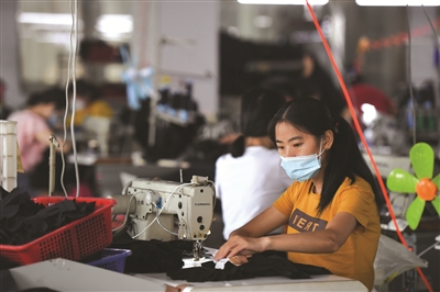 7月15日,在福建省石狮市一家体育用品有限公司,工人在生产内销的服装。该企业主动将60%的产能转为国内电商供货,以应对市场挑战。