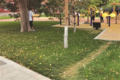 劳动公园作为我市市区景点之一,成为外地游客及市区群众旅游休闲的好去处,可是,个别人在游玩之余,却不爱护公物,做出了随意践踏草坪等不文明行为,既影响了景点的美观,又破坏了小草的生长。图为草坪已被踩出了一条小路。 本报记者李晓明摄