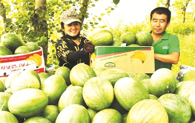 洮南市大通乡黄花村农民房春林种植黑水西瓜多年,近几年,他采取大棚种植西瓜方式并错时上市,经济效益良好,种植3亩地西瓜可收入1万多元。 本报记者李晓明摄
