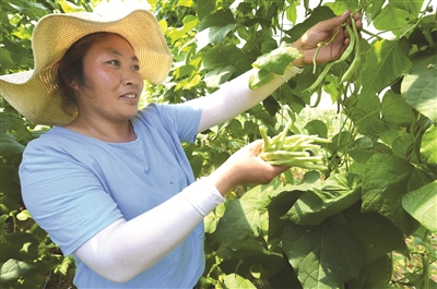 8月2日,已脱贫的建档立卡贫困户吴冬梅在河北省大厂回族自治县现代农业科技示范园区一家企业采摘蔬菜。