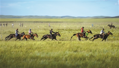 当日,锡林浩特市游牧文化节·白音锡勒牧场建场70周年那达慕在锡林浩特市白音锡勒牧场拉开帷幕。赛马、搏克、射箭等蒙古族传统项目吸引游客前来观看。 新华社记者连振摄