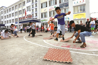 8月9日,淮北市相山区东山街道的家长和孩子参加“搭桥过河”趣味运动比赛。