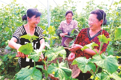 近年来,洮北区洮河镇那尼哈村着力打造“村集体+合作社+农户”模式致富平台,积极引导贫困户发展大棚种植、畜禽养殖,拓宽增收渠道。图为村民正在蔬菜大棚里劳作。 丁研摄