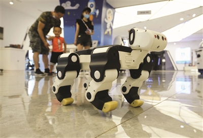 8月15日,在重庆两江机器人展示中心,家长带着孩子观看机器人表演。