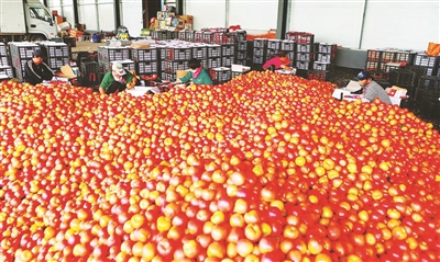 近年来,洮南市依托本地特有的农业资源,积极探索多元融合发展模式,着力打造了集种苗繁育、新品种研发、观光旅游为一体的福顺镇现代农业产业园。图为工人在分拣西红柿。 丁研摄