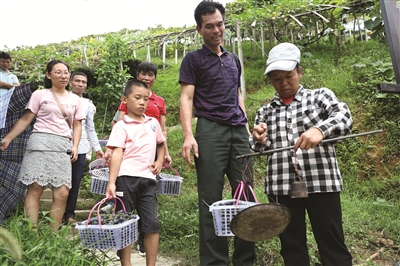近日,三江县同乐苗族乡归东村的茶叶和葡萄立体种植基地迎来不少游客体验采摘。据介绍,归东村以“村民合作社+专业合作社+农户+电商”的模式发展立体种植,全村种植葡萄1330亩,其中葡萄和茶叶立体种植200亩,已成为当地村民增收致富的重要产业。 新华社发(梁克川 摄)